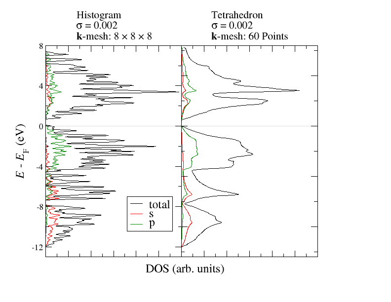 The following figure demonstrates the effect of this method on the DOS. Both calculations use the same charge density and the same number of -points inside the IBZ.