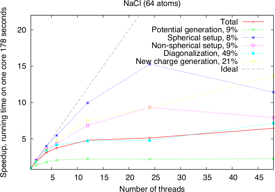 This type of parallelization is always chosen if the number of -points (K) is a multiple of the number of MPI processes (P). If is not an integer, a mixed parallelization will be attempted and M MPI processes will work on a single k-point, so that is an integer. This type of parallelization can be very efficient because the three most time-consuming parts of the code (Hamiltonian matrix setup, diagonalization and generation of the new charge density) of different points are independent of each other and there is no need to communicate during the calculation. Therefore this type of parallelization is very beneficial, even if the communication between the nodes/processors is slow. The drawback of this type of parallelization is that the whole matrix must fit in the memory available for one MPI process, i.e., on each MPI process sufficient memory to solve a single eigenvalue-problem for a single point is required. The scaling is good as long as many points are calculated and the potential generation does not become a bottleneck. The superideal scaling in the following figure is caused by caching effects.